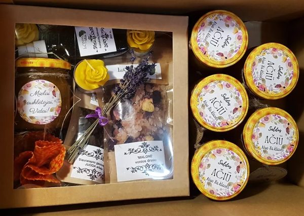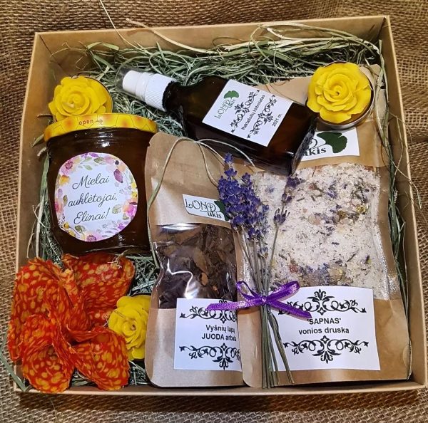 Šį rinkinį sudaro: 200ml medaus su personalizuota etikete; 3 vnt bičių vaško arbatinės žvakutės- rožytes; 50ml raktažolių hidrolatas; 10g vyšnių lapų JUODA arbata;  vonios druskų mišinys; vaškinė drobelė (dabar kaip gėlė, o vėliau mokytoja uždengs puodynę/ ąsotį/ dubenėlį/vaisius/ daržoves ir t.t.).